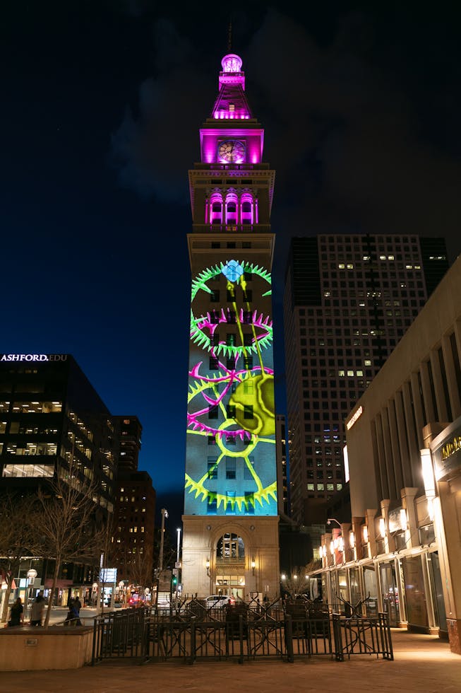 clock-watching is an experimental group exhibition that subverts the measurement of time on a historic clock tower in downtown Denver. Rather than keep time in the traditional sense—by seconds, minutes, and hours—this exhibition explores tracking time by the day of the week through a series of newly commissioned nighttime video projections. Collectively, these digital artworks acknowledge the perception of time slowing down during the COVID-19 pandemic.