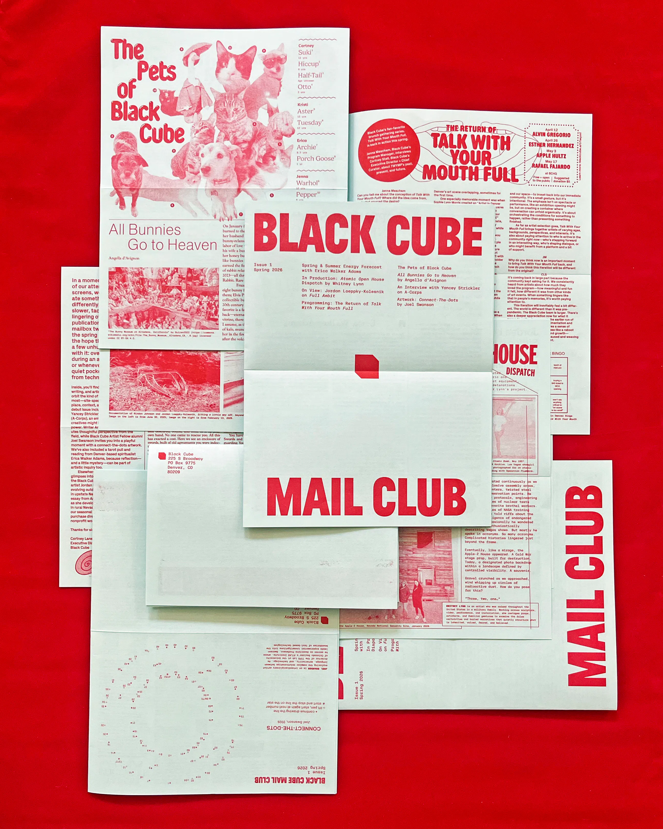 Join the club! Black Cube Mail Club is a free risograph-printed newsletter snail-mailed straight to your mailbox, twice a year. This new publication offers behind-the-scenes organizational musings, dispatches from the world of site-specific art, interviews with artists, and much more. Born from our team's love of storytelling, thoughtful design, and holding tangible things.