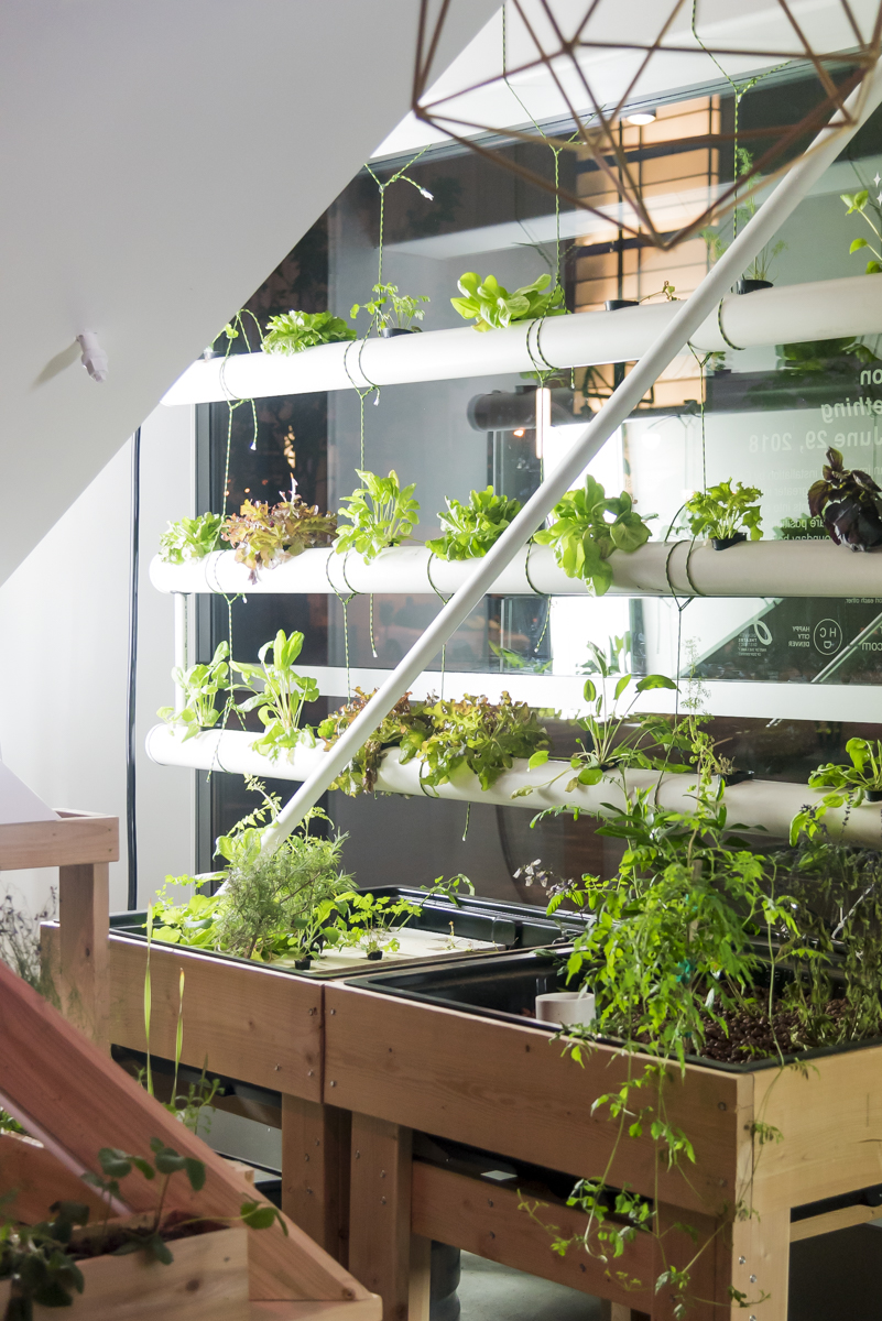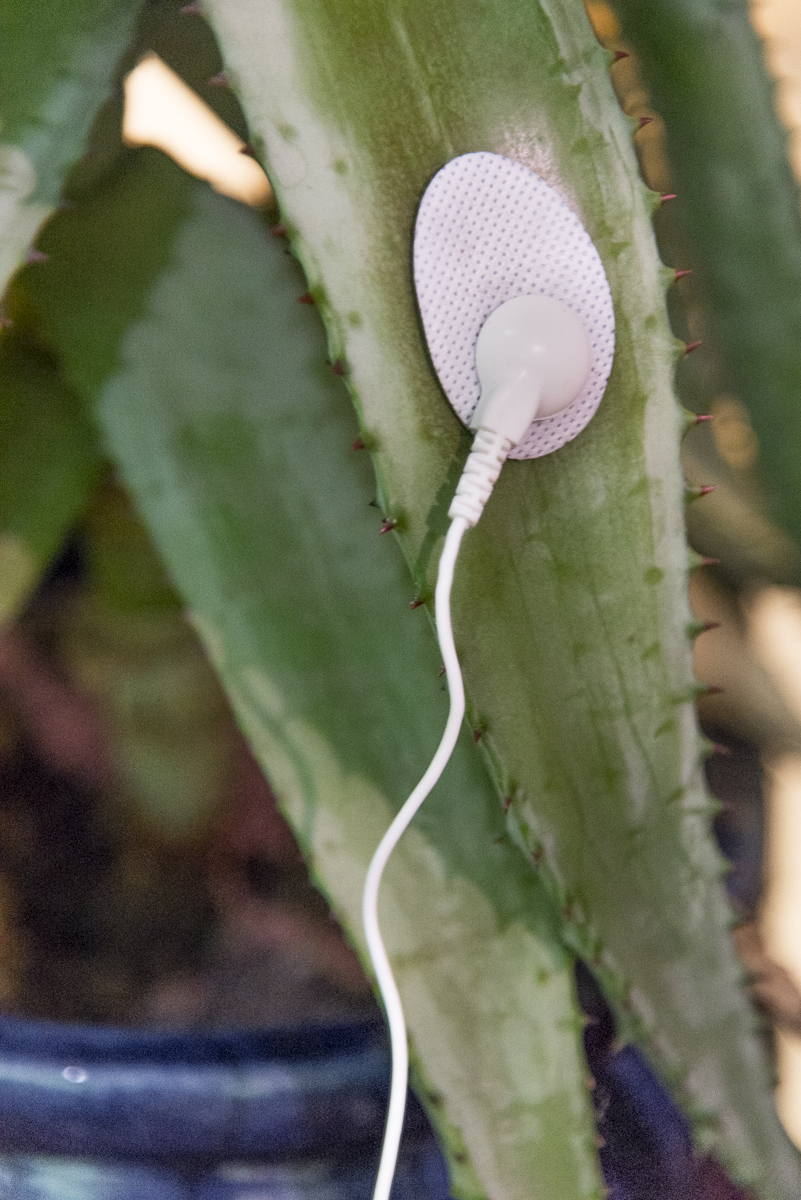 At the entry of the exhibition is a custom-built aquaponics installation, where visitors find an integrated system composed of aquaculture (raising fish) and hydroponics (the soil-less growing of plants in water). In this symbiotic system, the fish waste provides an organic food source for the plants, and the plants naturally filter the water for the fish. Building on this network, Barton’s addition of experimental sound and sensing technologies channel the plants’ response to the interior conditions by transmitting audio to visitors.